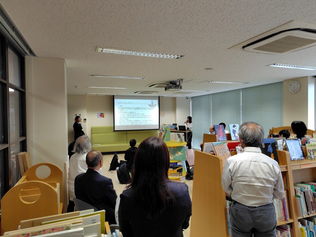 セレモニーでは、松岡尚敏学長による挨拶に続き、岡正明附属図書館長が設計コンセプトについて説明しました。「①学生の学びの場としての活用」「②社会に開かれたスペースとしての展開」「③絵本とICTを融合させた新たな学びの可能性の探求」の三点を柱に構想されたことが語られました。
