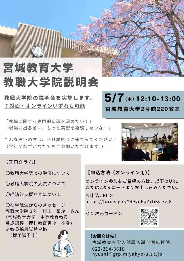 宮城教育大学の教職大学院で学ぶ魅力について知っていただくため、下記の日程で教職大学院の説明会を開催します。